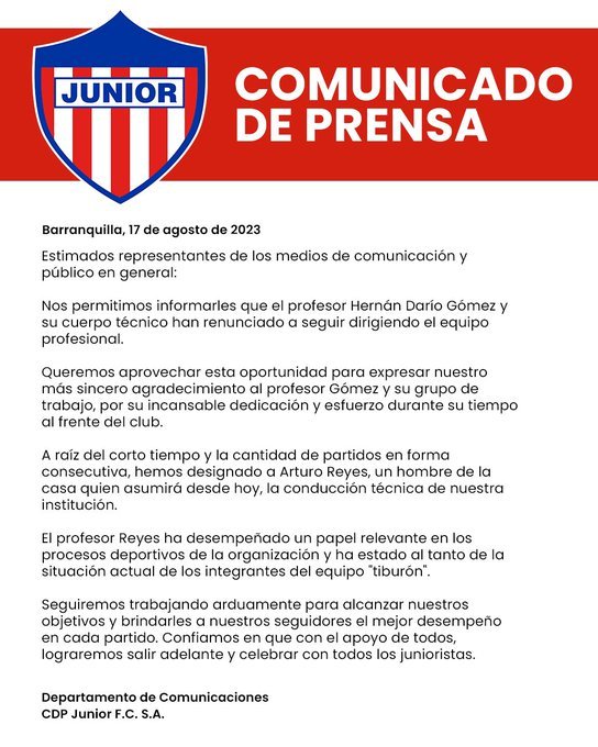 Tanto fue el cántaro al pozo hasta que terminó recentándose la pita, siendo realidad la salida de Hernán Darío ‘El Bolillo’ Gómez y su cuerpo técnico renunciaron a la dirigencia del Junior de Barranquilla, así anunció el club a través de un comunicado de prensa.