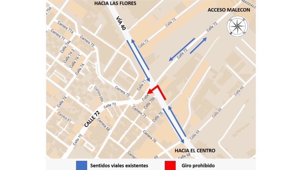 Es decir que los conductores que anteriormente realizaban el cruce a la izquierda hacia la calle 72, autorizado por semáforo en la vía 40 con calle 72, ya no lo podrán realizar. Ahora tomarán las calles 66, 68 o 69 hacia el sur (estadio Romelio Martínez) o cruzarán a la derecha en la calle 72 hacia la glorieta de la avenida del Río del Gran Malecón y retomarán la calle 72 hacia el sur.