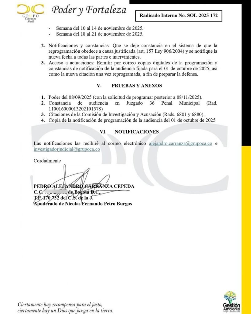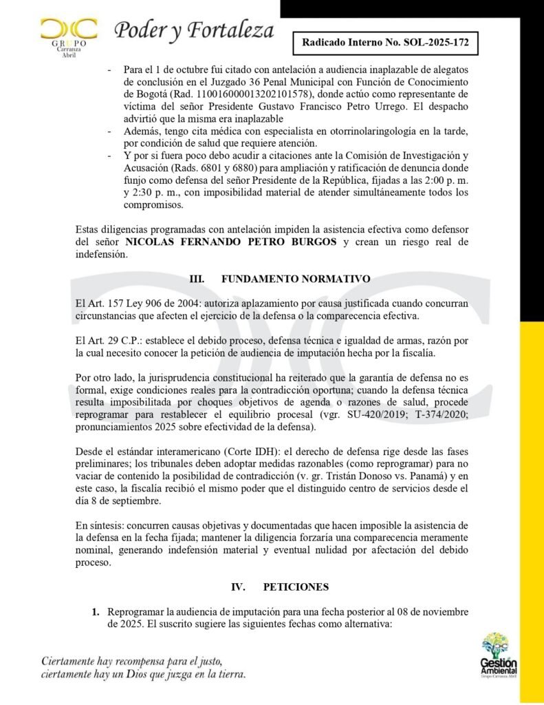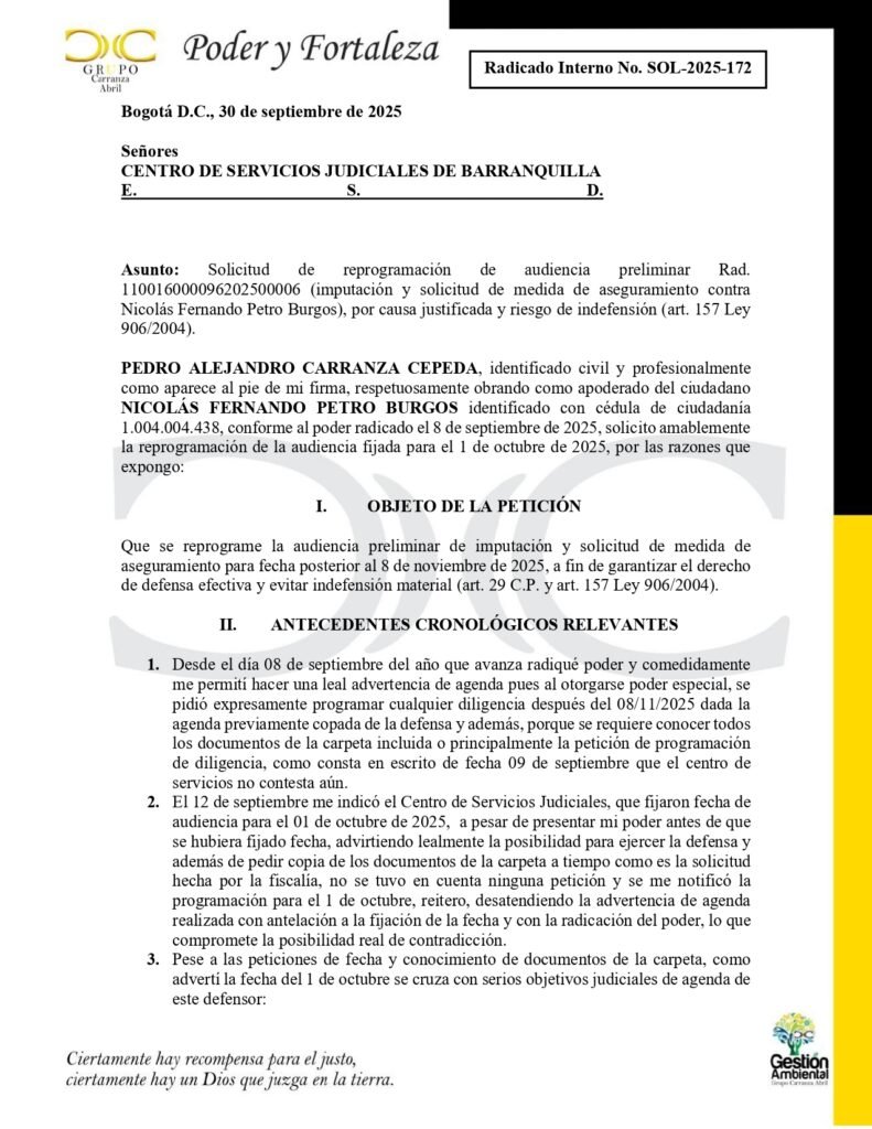 El abogado Pedro Alejandro Carranza, apoderado del ex diputado del Atlántico, Nicolás Petro, envió en la mañana de hoy un oficio al juzgado de control de garantías de la ciudad de Barranquilla para pedir el aplazamiento de la audiencia de imputación de tres nuevos delitos al hijo del presidente Gustavo Petro por parte de la Fiscal Lucy Laborde, quien además había anunciado que pediría de la detención del sindicado en un centro de carcelario. De acuerdo al contenido del documento el defensor tiene una agenda apretada y sólo puede atender sus actividades después del 8 de noviembre de 2025.