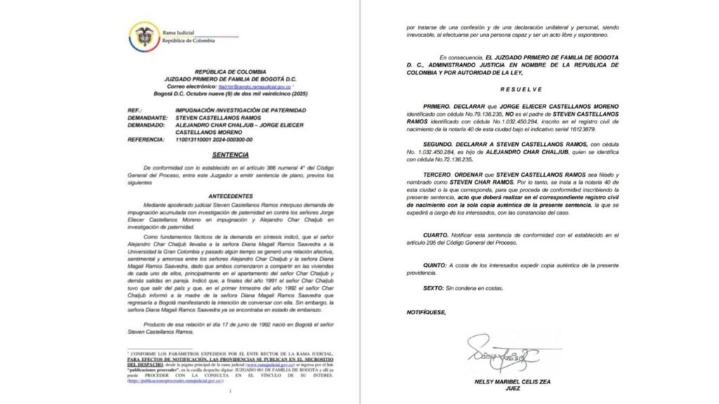 Tres años después que el Juzgado Primero de Familia del Circuito de Bogotá adelantara el proceso de filiación entre el alcalde de Barranquilla, Alejandro Char Chaljub y Steven Castellanos Ramos; el Tribunal de Bogotá confirmó la paternidad del burgomaestre sobre el joven ordenándole reconocerle de inmediato ante la Notaria 40, donde está el Registro de nacimiento. Es decir quecambiará el apellido Castellanos por Char.