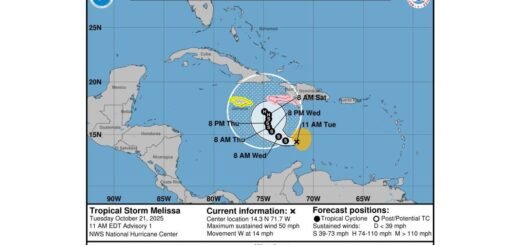 La tormenta tropical Melissa ubicada sobre el oriente del mar Caribe, cerca de 14,3N 71,7W con vientos máximos sostenidos de 83 km/h y una presión mínima...