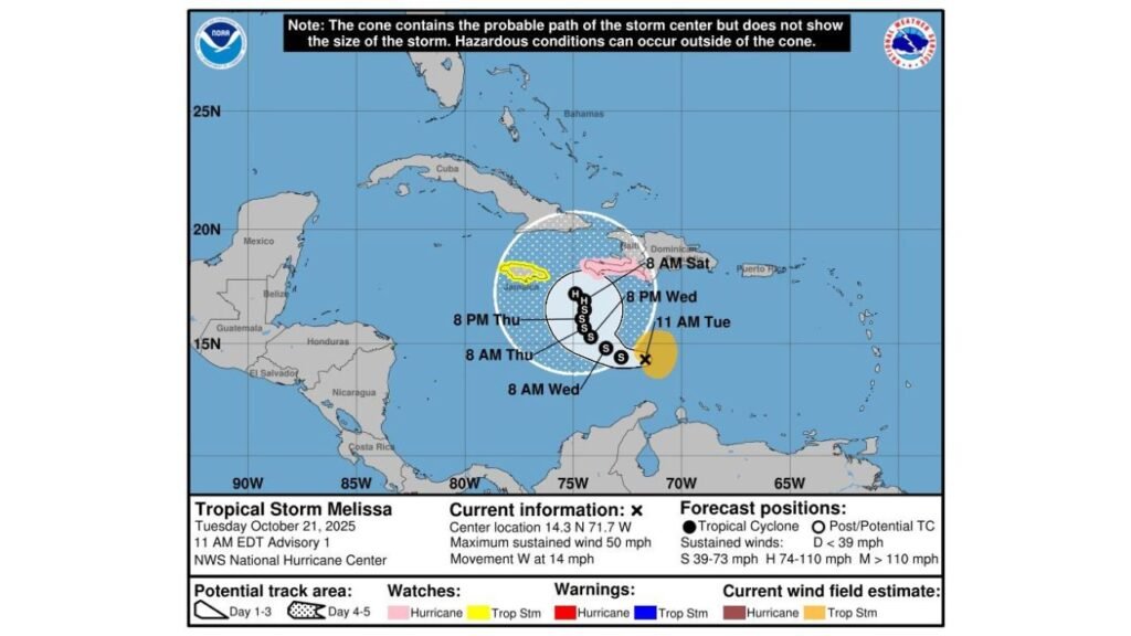La tormenta tropical Melissa ubicada sobre el oriente del mar Caribe, cerca de 14,3N 71,7W con vientos máximos sostenidos de 83 km/h y una presión mínima central de 1003 mb se desplaza hacia el occidente a 22 km/h.