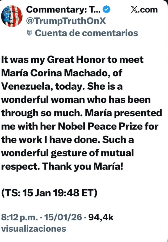 Uno de los momentos más simbólicos del encuentro fue la entrega por parte de Machado de su Premio Nobel de la Paz, como gesto de reconocimiento al papel de Trump en la presión internacional contra el régimen venezolano. El presidente calificó el acto como “un gesto maravilloso de respeto mutuo”, interpretado en círculos diplomáticos como una reafirmación del alineamiento político entre Washington y la principal figura de la oposición democrática venezolana.