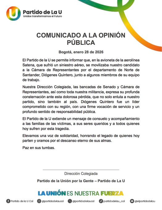 Partido de la U lamenta muerte de Diógenes Quintero en accidente de avión de Satena – ALTERNATIVACARIBE
