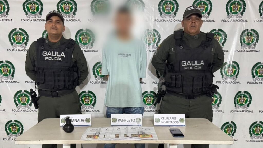 El procedimiento se llevó a cabo durante labores de control y seguimiento, donde las autoridades sorprendieron al presunto delincuente con panfletos extorsivos y una granada, elemento de uso privativo de las Fuerzas Armadas. Por estos hechos, fue capturado por el delito de fabricación, tráfico, porte o tenencia de armas, municiones o explosivos de uso restringido.