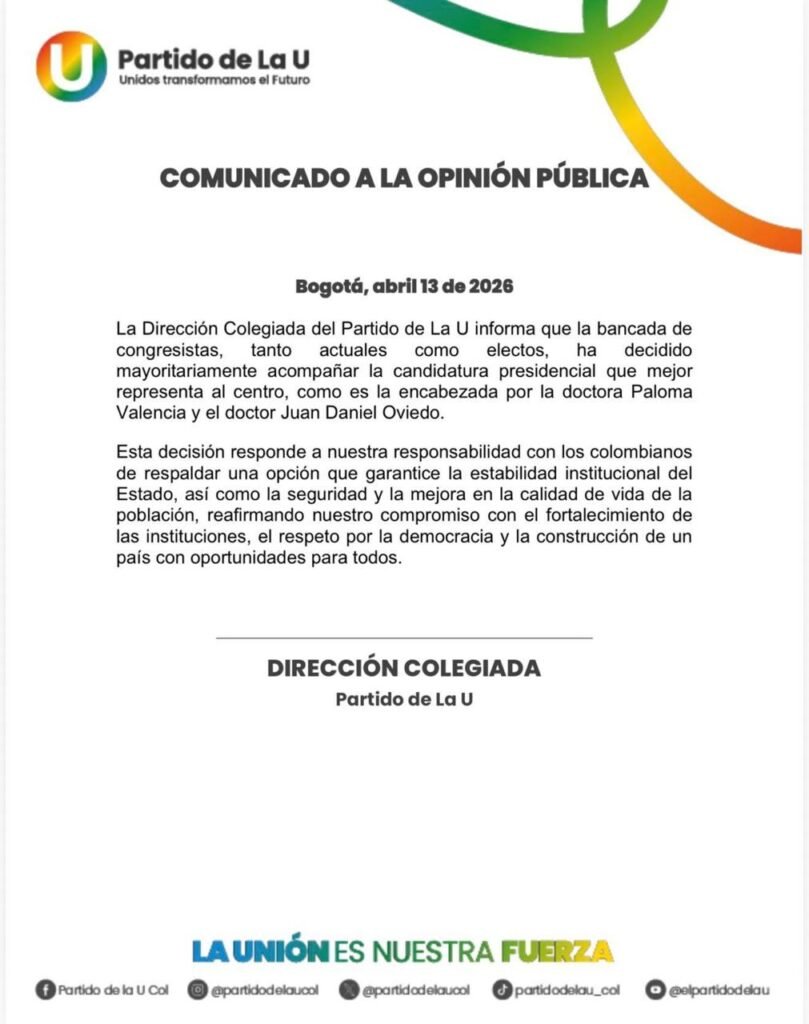«La Dirección Colegiada del Partido de La U informa que la bancada de congresistas, tanto actuales como electos, ha decidido mayoritariamente acompañar la candidatura presidencial que mejor representa al centro, como es la encabezada por la doctora Paloma Valencia y el doctor Juan Daniel Oviedo».